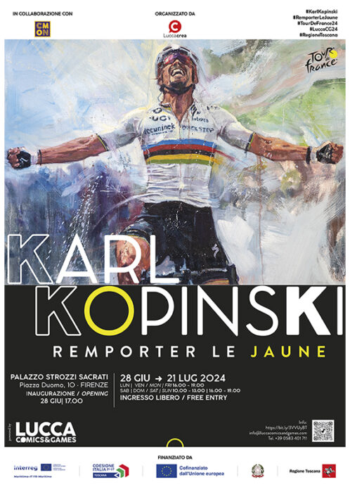 Organizzata da Lucca Comics & Games e promossa da Regione Toscana, con il contributo del Fondo Europeo di Sviluppo Regionale per la Mobilità Sostenibile e di Programma Interreg Italia-Francia Marittimo, Karl Kopinski: Remporter le Jaune è stata anche una mostra dedicata ai grandi eroi del ciclismo internazionale ritratti da uno dei più importanti maestri dell’illustrazione in Europa, Karl Kopinski, ospitata a Palazzo Strozzi Sacrati, a Firenze. La mostra ha esposto oltre 30 le opere che dal 28 giugno al 21 luglio potranno essere ammirate, gratuitamente.